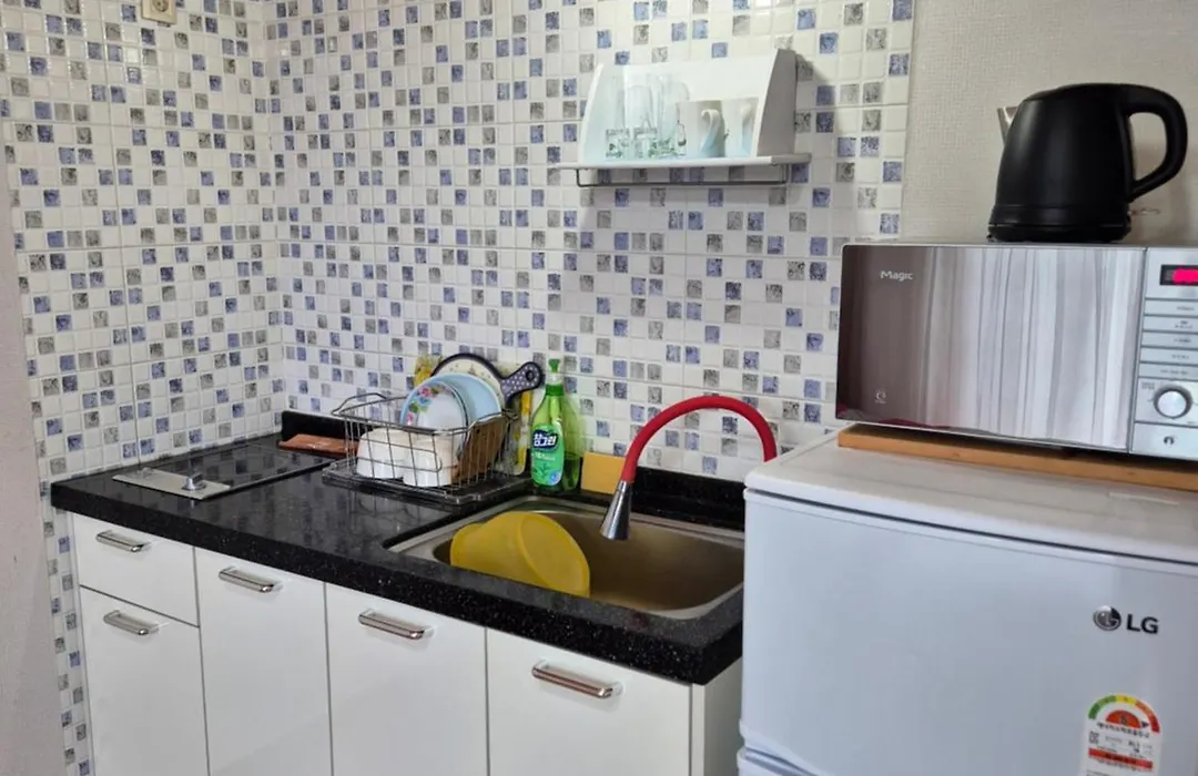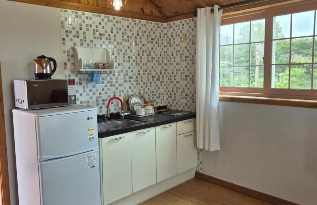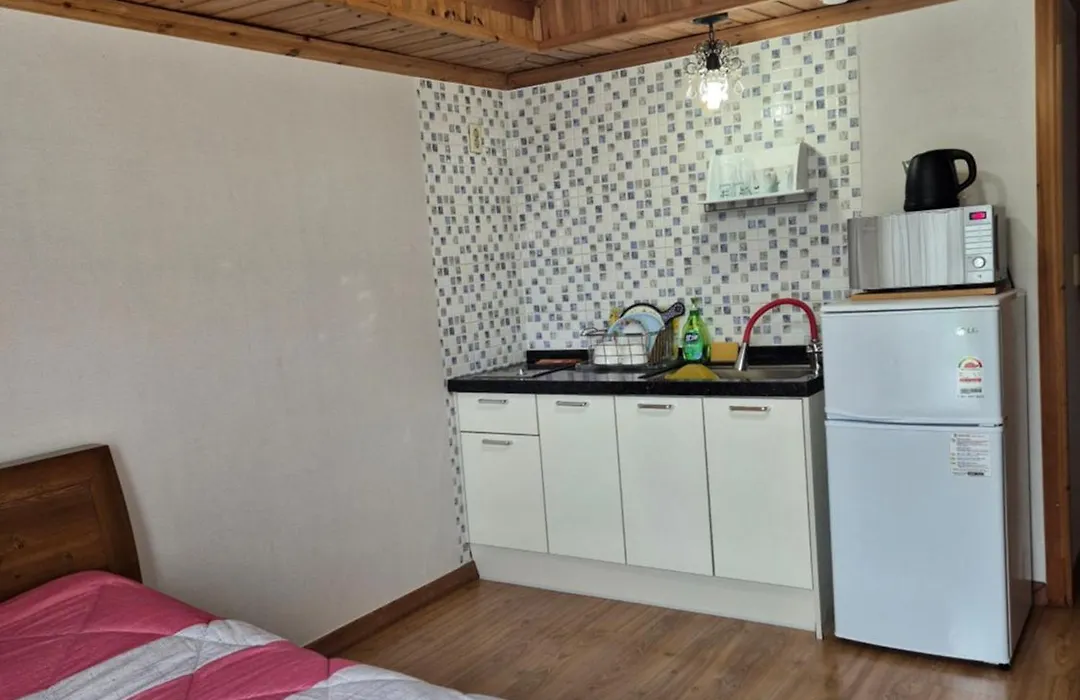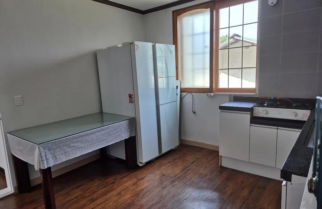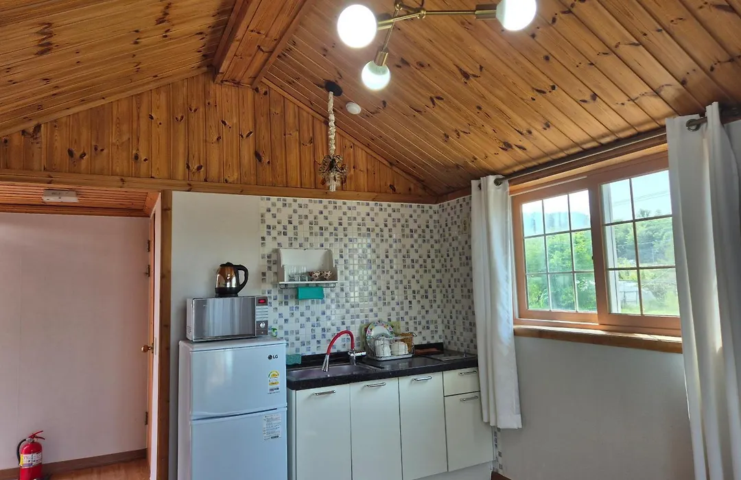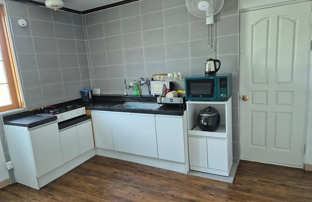 Ganghwa Sweet House Pension villa provides a kitchen with an electric kettle, a refrigerator, and glassware for guests' use.